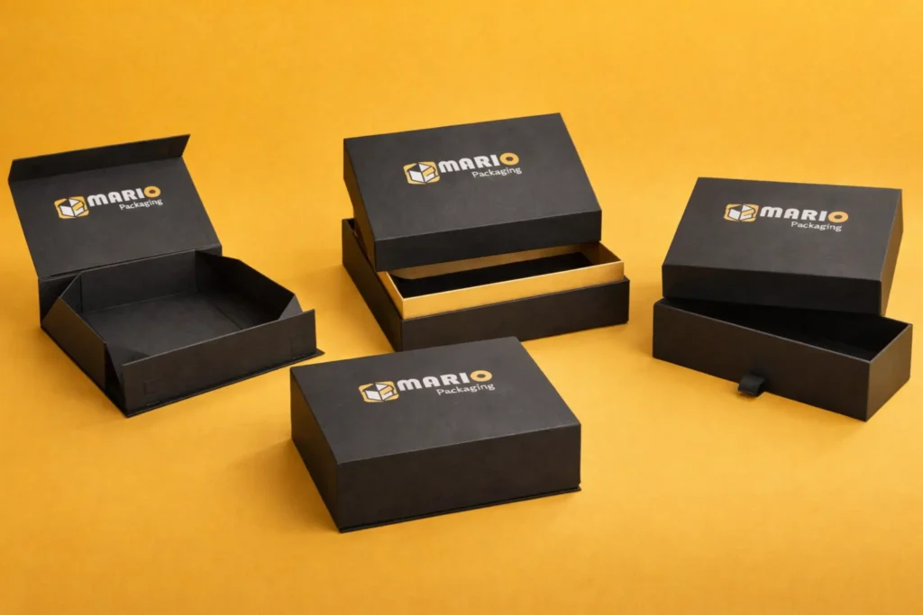 Luxury rigid boxes with magnetic lids for secure closure and premium presentation.